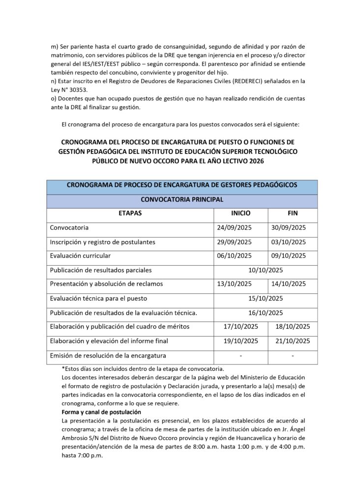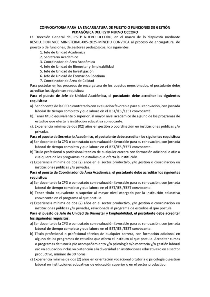 Comunicados Convocatoria para encargatura de puestos de gestión pedagógica del IESTP “Nuevo Occoro” – 2026 PorAdmin IESTP septiembre 24, 2025octubre 1, 2025